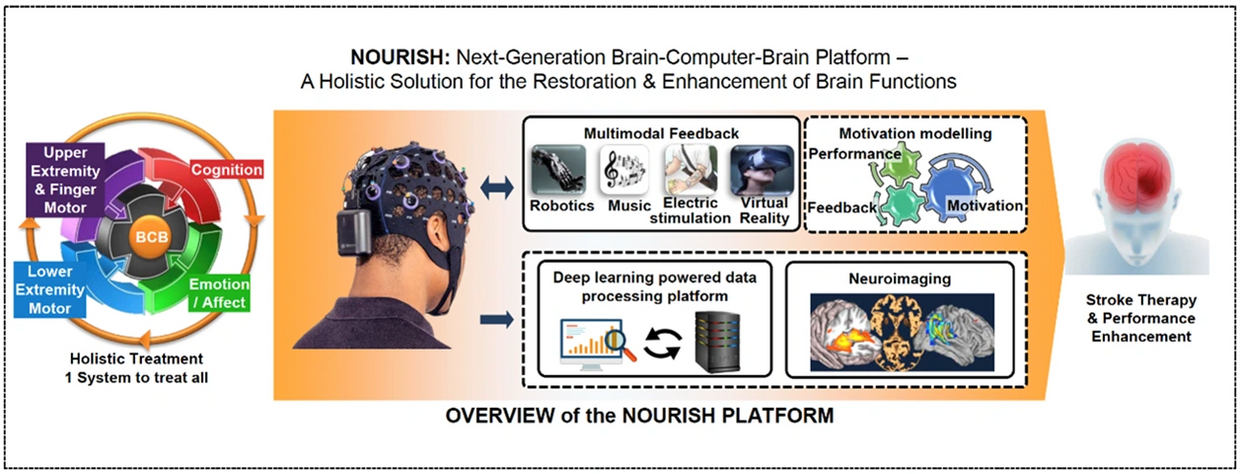 In this programme, we propose to develop a digital healthtech solution to address the healthcare challenges: Next-Generation Brain-Computer-Brain Platform – A Holistic Solution for the Restoration & Enhancement of Brain Functions (NOURISH). The NOURISH programme proposes to develop the best-in-class, holistic solution for the restoration and enhancement of motor, cognitive and emotional functions in one system. The NOURISH platform would offer a non-drug based, cost-effective and clinically feasible solution for effective stroke rehabilitation and mood therapy.